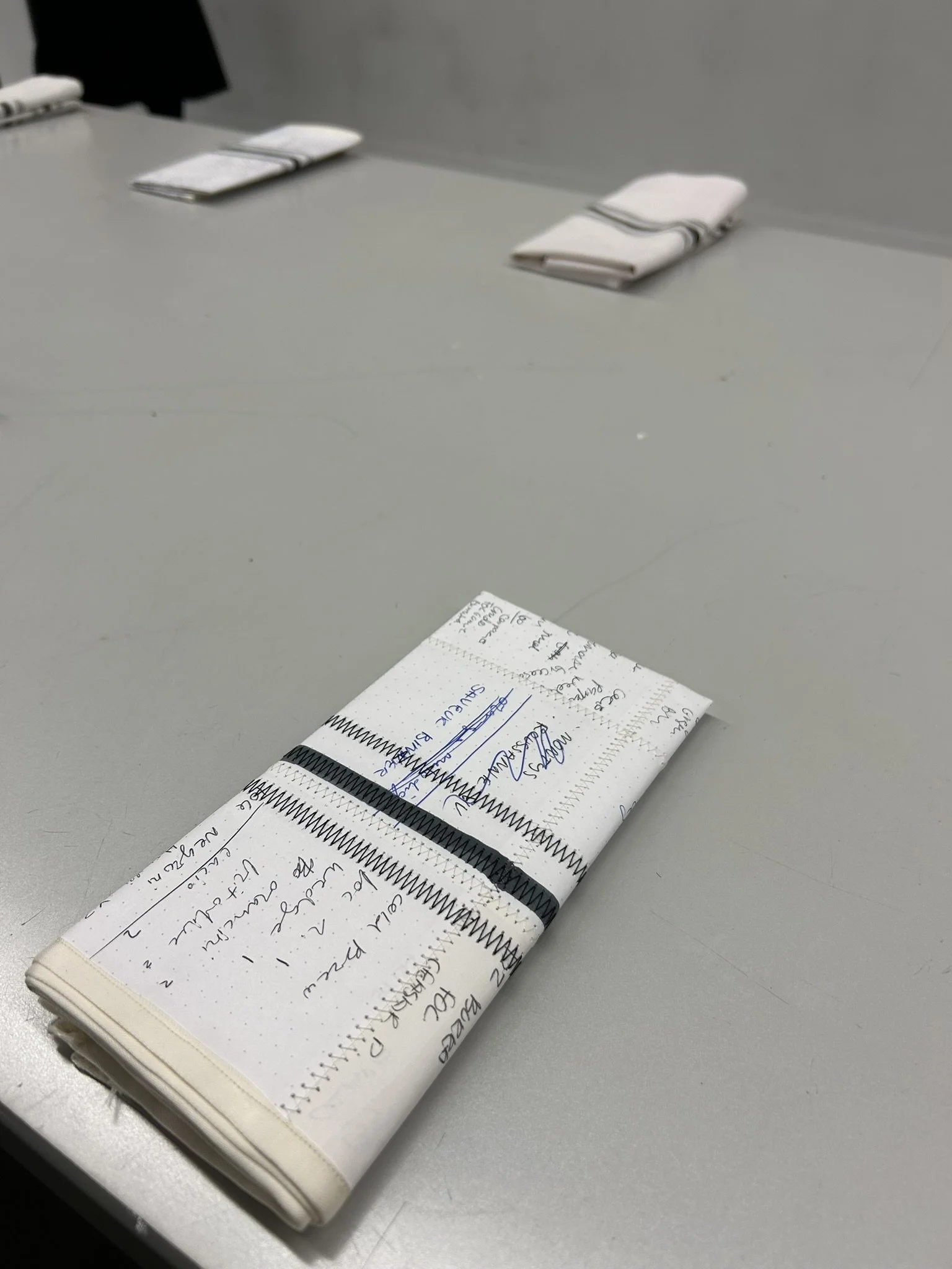 Presented now as a curtain, the work transforms the textile once more: from the rigid manners of fine dining and the flat, autonomous surfaces of painting to a three-dimensional, functional, and domestic object of craft and decoration. Associated with both privacy and display, the curtain functions here as a threshold between spaces—work, studio, and home. The liteau thus becomes an intersection of my necessities: money, creation, and intimacy.