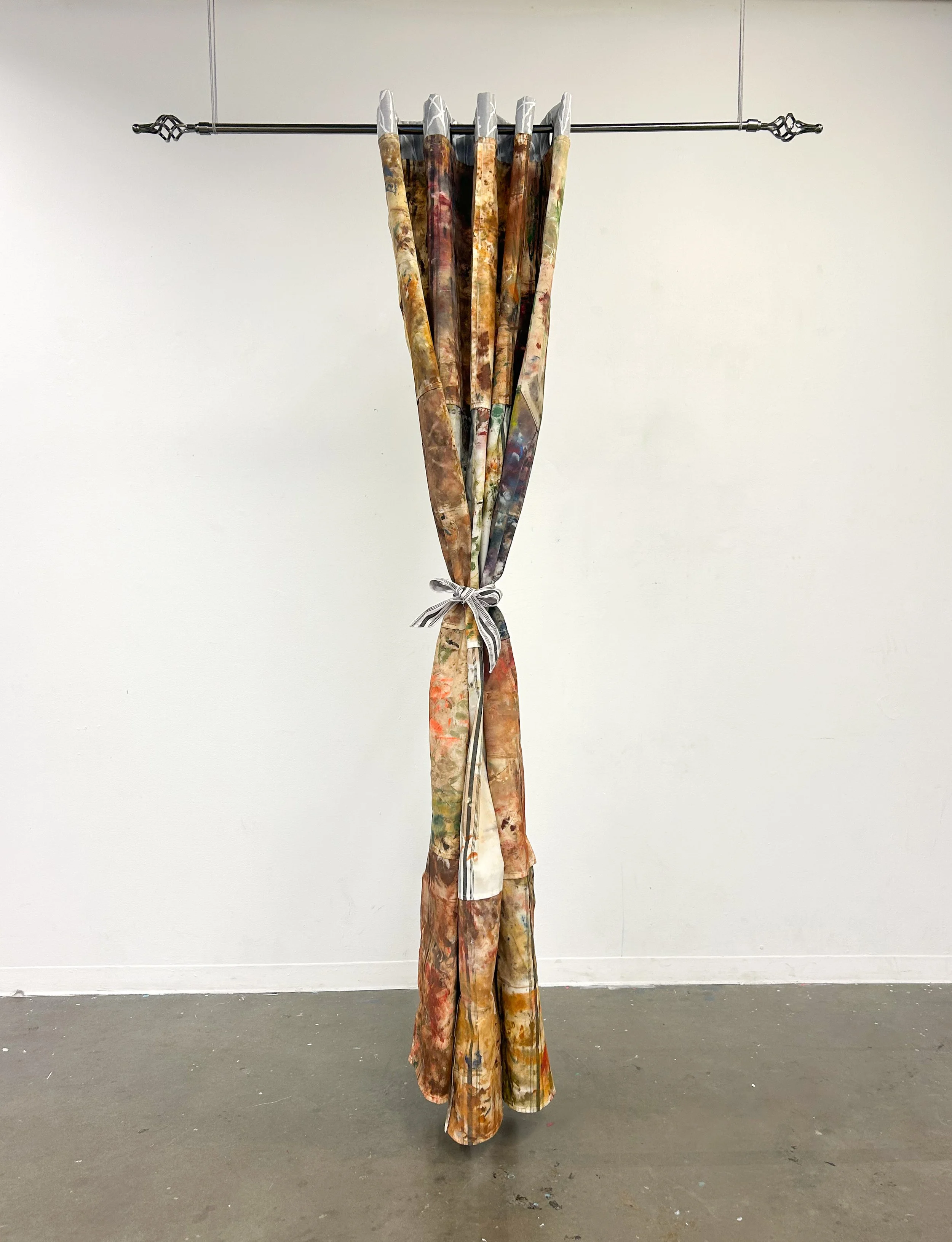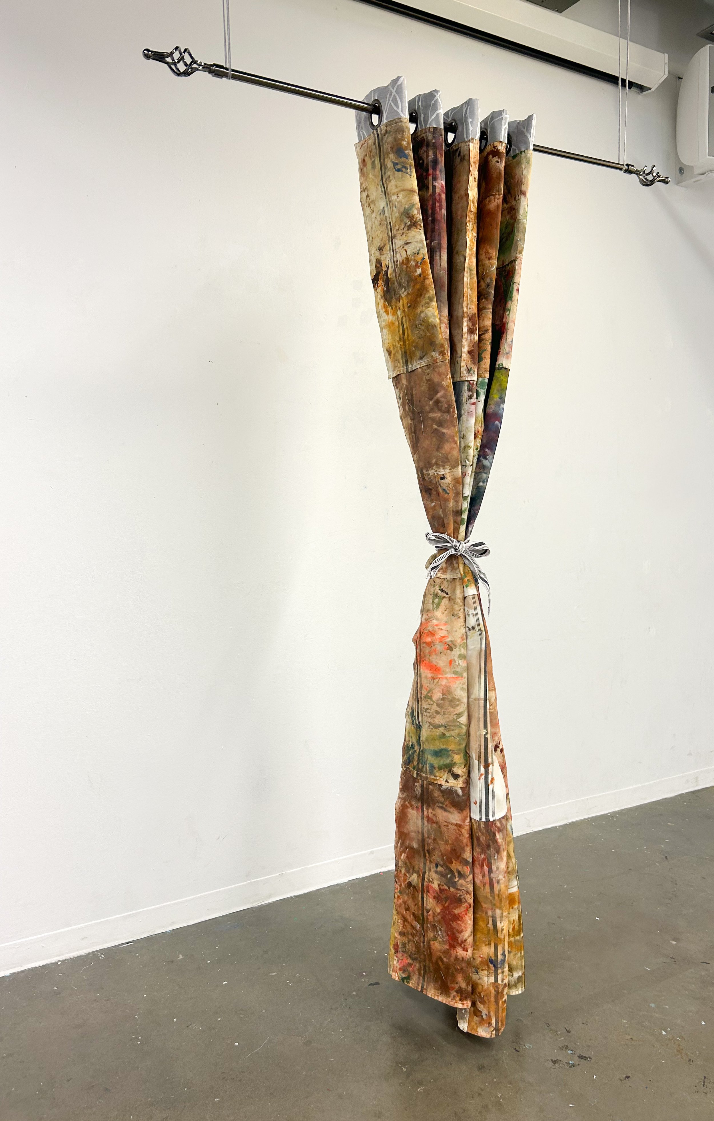 Liteaux, Torchons, Rideau is a work that blends the spaces of labor, art, and home. It follows the journey of the liteau—a tablecloth used in fine dining that carries the codes of service and repetition, of manners and good taste. Over time, these textiles entered my studio life as rags, absorbing pigments and oils until their striped surfaces became abstract records of work. Through this shift, the liteau moved from the table to a support for creation. Similarly, my day job as a server provides the support for my art practice.